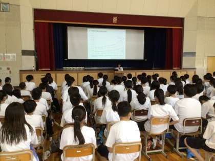 「スマホが脳に与える影響とスマホ依存症について」のテーマのもと、1年生が学校保健委員会を開催しました。スマホの影響について詳しい学校薬剤師の方を講師としてお招きし、豊富な資料やクイズを交えながらお話を聞きました。
