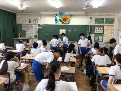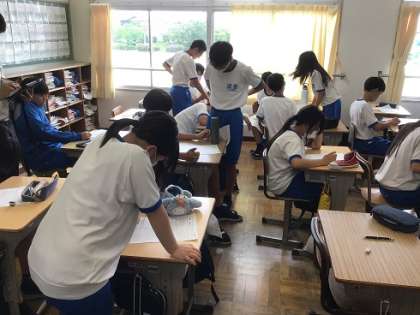 3年生の数学科です。これまでの復習問題を仲間と教え合いながら取り組んでいました。