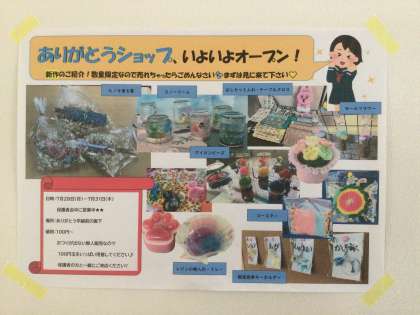 今回も、ありがとう学級の生徒たちが手作りした様々なグッズを「ありがとうショップ」として販売します。個別懇談会の期間中(7/28月〜31木)に、ありがとう学級前の廊下でオープンします。新作もあります。懇談会の折などで、ぜひお立ち寄りください。