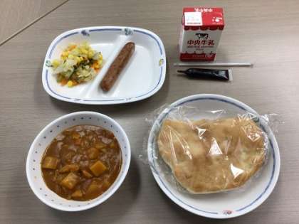 チキンカレー、ナン、フレンチサラダ、ウインナー、コーヒー牛乳の素が出ました。ナンは豊田市産の小麦が使われています。