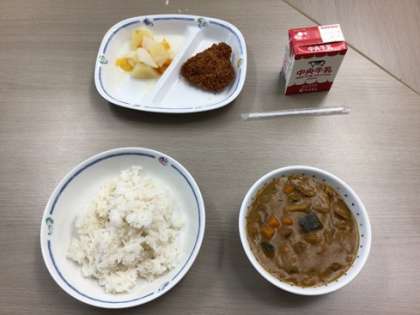 今日の献立は、夏野菜のカレーライス(麦ごはん)、なしポンチ、ヒレカツでした。夏休み中の食生活はどうでしたか?暑い日が続きますが、栄養バランスに気をつけて、体調を整えていきましょう。