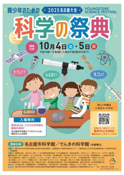 9月2日(火)「青少年のための科学の祭典」ご案内 公開日 2025/09/02 更新日 2025/09/02 お知らせ 10月に名古屋で開催されます。関心のある方はぜひご参加ください。 「青少年のための科学の祭典」→ こちら