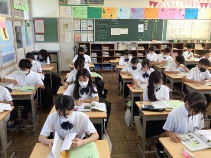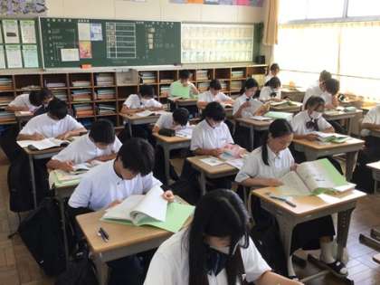 今日から3日間の予定で、前期期末テストが始まりました。写真は1年生です。テスト直前で最後の見直しを進めています。とても集中できていますね。