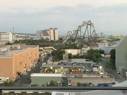 おはようございます。ホテルの窓越しにUSJが見えます。天候も大丈夫です。今日もがんばりましょう。