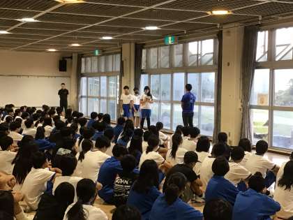 朝のつどいが始まりました。小雨が降っているので、屋内で行いました。