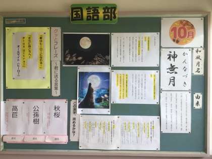 国語科の掲示板です。新館の東階段にあります。10月(神無月)についてのいろいろな知識等が紹介されています。ぜひ読んでみてください。