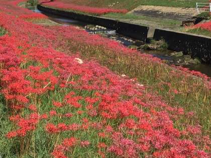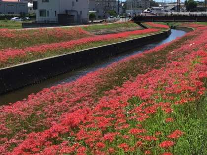 逢中学区の名所とも言える逢妻女川沿いの彼岸花です。毎年9月中旬から下旬にかけて、逢妻女川の天王橋(丸根町)から男橋(宮上町)間、約450mの両岸の土手に彼岸花が咲き誇ります。真っ赤に色付いた彼岸花を鑑賞したり、写真撮影をするなど、毎年、豊田市内外の多くの人々がこの場所を訪れます。
