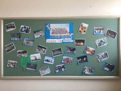 2年生の掲示板です。上は自然教室の思い出写真です。砂浜で撮った全員写真もあります。