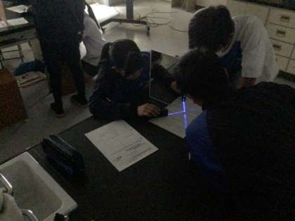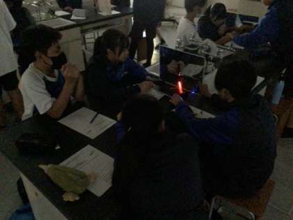 1年生の理科です。部屋を暗くして、光が鏡に反射する様子を観察しています。どんな特徴があるか気がついたかな?