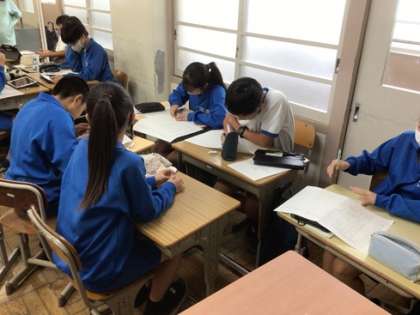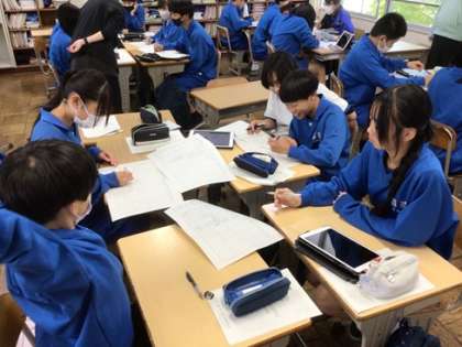 2年生の総合的な学習の時間です。11/14(金)に「キャリアチャレンジデイ」を計画しています。キャリア学習の一環として、企業の方とオンラインで交流します。そこに向けて、参加してくださる企業について調べています。