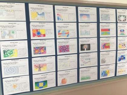 3年生が美術科の授業で制作したデザインが掲示されています。アクセントやグラデーションなど、構成美の要素を使って工夫をしたものです。