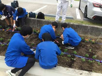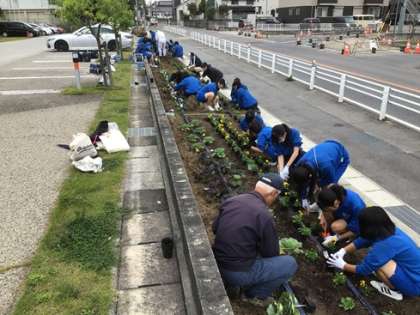 逢中生ボランティアが、逢妻交流館前の県道沿いの花壇で花の苗を植えました。