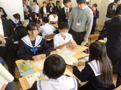 2年生の数学科です。一次関数の学習なのですが、カルタの要素を取り入れて、式・表・グラフなどを関連づけながら学んでいきます。