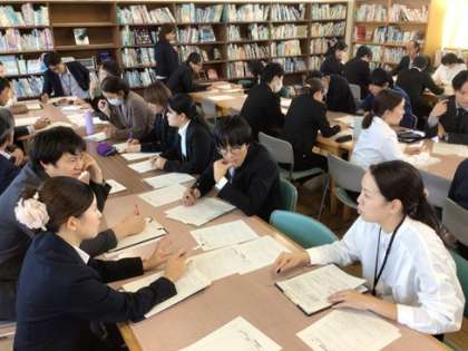 今回の数学科の研究授業は、校内教員研修の場としても位置づけています。授業後、講師の方と共に授業づくりについて教師同士で学び合いました。これからの教育活動につなげていきたいと考えます。