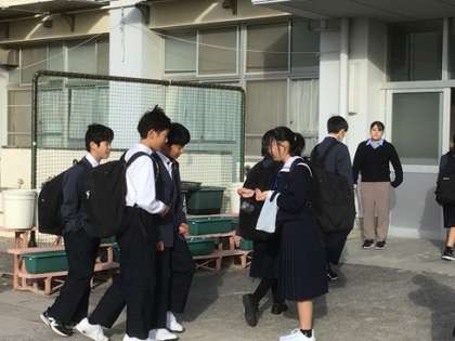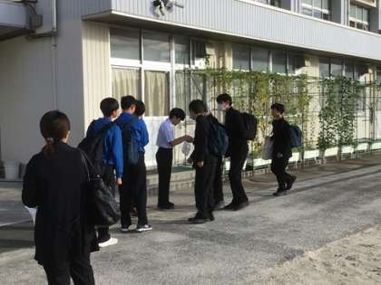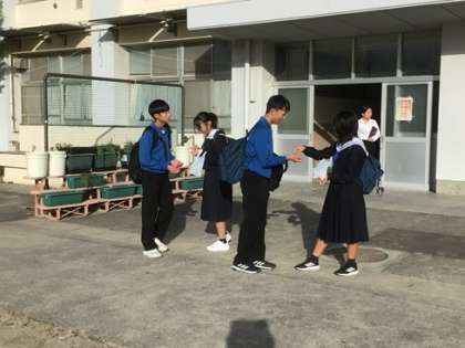 昨日から始まっている、登校時のあいさつ運動です。生徒会執行部と代議員が、笑顔と活気あふれる逢中を目指そうと活動としています。