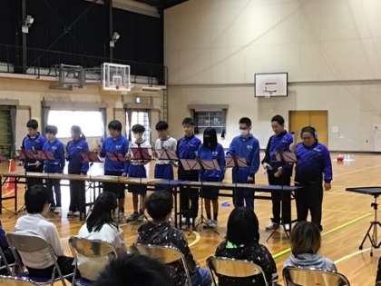 ありがとう学級の生徒たちが、小清水小学校・美山小学校の児童を体育館に招いて、交流活動を行いました。まずはいっしょに「ジェンカ」をしたり、中学生がトーンチャイムの演奏やダンスを披露したりしました。