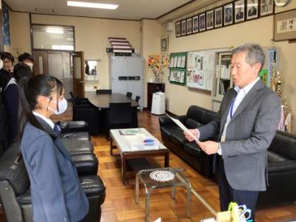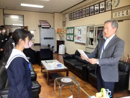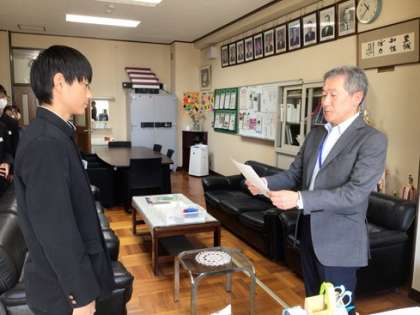 校長室で逢中賞の表彰をしました。先日開催された宮口フェスタで活躍した逢中生ボランティアです。区長さんから推薦をいただきました。