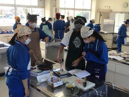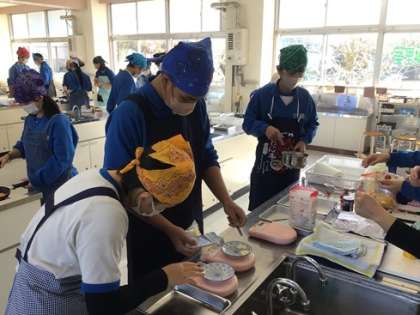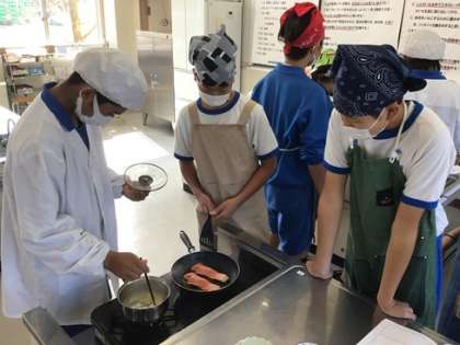 2年生の家庭科です。調理実習で、鮭のムニエルと粉吹きいもを作っています。火加減が難しそうですが、協力して取り組んでいました。