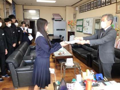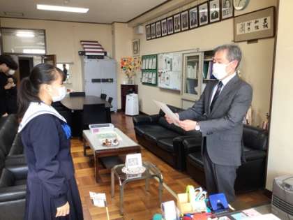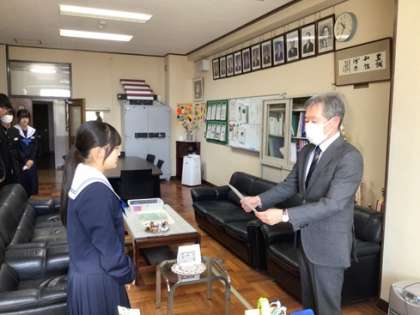 校長室で逢中賞の表彰をしました。下校途中に困っている小学生を助けたり、地域のイベントで活躍したりした子たちです。