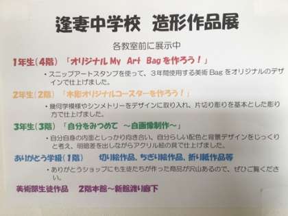 今日から個別懇談会が始まります。来校くださった保護者の皆様に、ぜひ見ていただこうと「造形作品展」を開催しています。逢中生が、美術科の授業で制作した作品を展示しておりますので、ぜひご覧ください。
