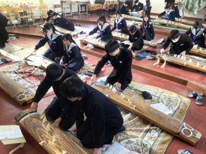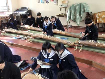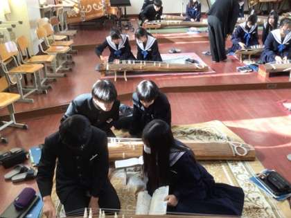 3年生の音楽科です。日本の伝統楽器である琴に挑戦です。隣の子と協力しながら取り組んでいました。