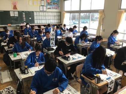 写真は2年生です。題字は「大器晩成」です。新しい年にかける思いをこめて、それぞれの生徒が筆を走らせていました。
