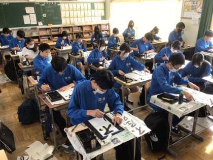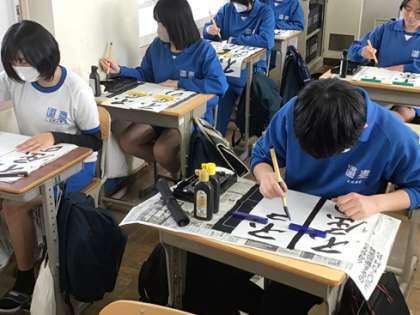 写真は3年生の様子です。題字は「不屈の精神」です。
