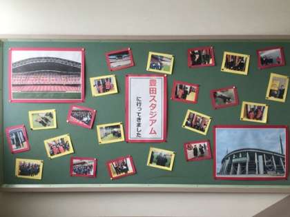2年生の学年掲示板です。12月に行った豊田スタジアム見学のスナップ写真がたくさん掲載されています。スタジアムの裏側を知ることのできる機会でしたね。