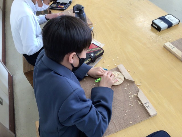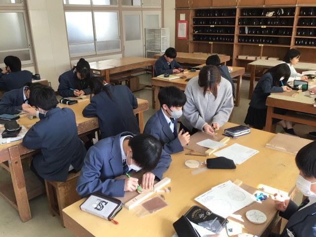 2月9日(月)授業の様子 公開日 2026/02/10 更新日 2026/02/10 お知らせ 1年生の美術科です。彫刻刀を使って、小物入れのふたを木彫りで制作しています。それぞれの個性が光る作品が出来上がりそうです。