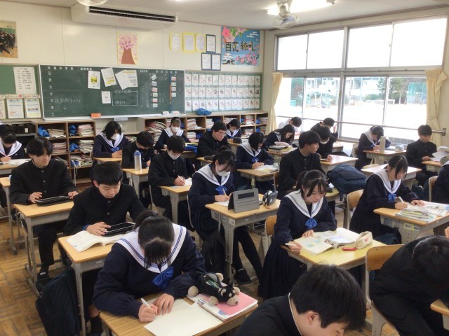 2月10日(火)最後の定期テストがんばるよ1 公開日 2026/02/11 更新日 2026/02/11 お知らせ 12日(木)から、1・2年生は今年度最後の定期テストとなる「学年末テスト」が始まります(12木・13金・16月の3日間、3年生は13金から2日間の卒業テスト)。写真はテスト勉強に励む2年生です。今回のテスト勉強を通して、今年度の学習内容をしっかりと身につけていきましょう。