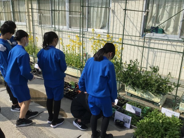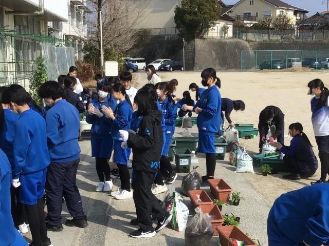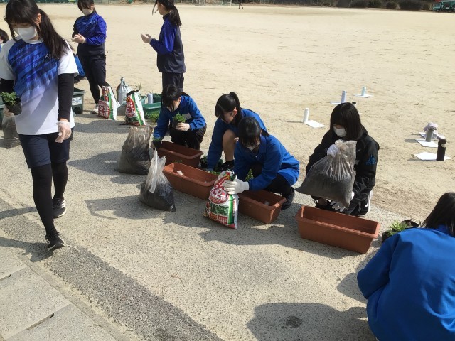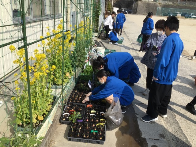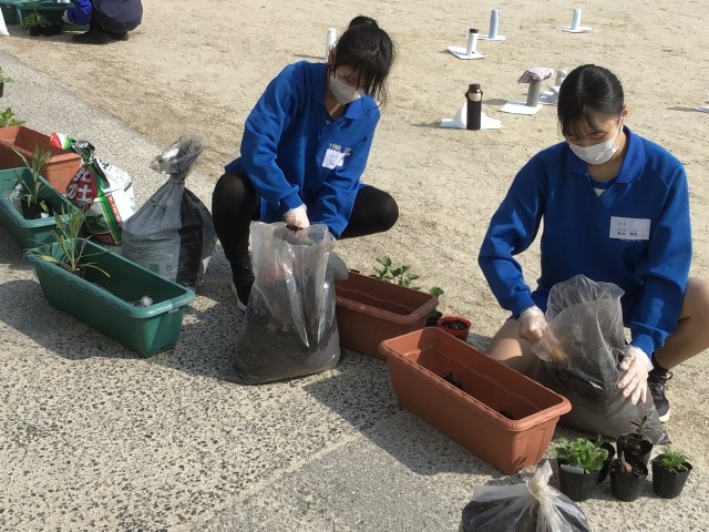 たくさんのきれいな花の中で、3年生には卒業を迎えてもらおうと、逢中ボランティアが花の寄せ植え活動を行いました。花の苗や球根を各自で選んで、プランターや鉢に植えます。1年生に加え、とてもたくさんの2年生が参加しました。
