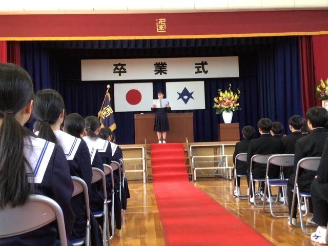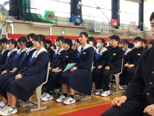 在校生代表による送辞です。3年生と共に過ごした部活動や体育祭・合唱祭など行事の思い出をはじめ、3年生への憧れと感謝の気持ちが語られました。また、先輩の「愛」を受け継ぎ、この逢妻中学校を人と人のつながりを大切にし、自ら考え、人のために行動できる「真心」をもった学校へと導く決意も語られました。素晴らしい贈る言葉でした。