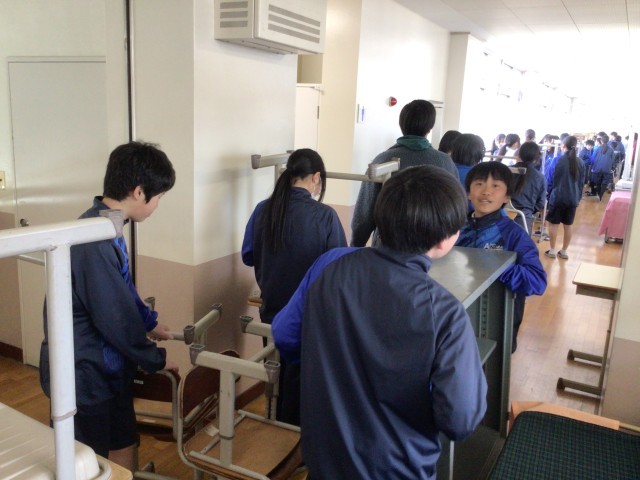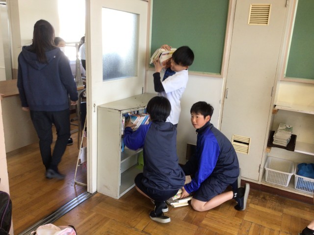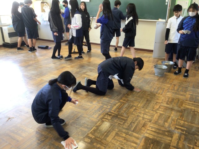 今日は1年生が年度末の大掃除を行いました。教室内の机や椅子、ロッカーなどを運び出して、普段は手が届かない箇所まできれいにしました。