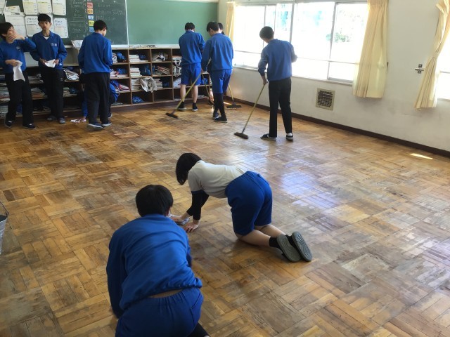 2年生が年度末の大掃除を行いました。教室内の机や椅子、ロッカーなどを全て運び出し、普段はなかなか掃除ができないところまできれいにしようとがんばりました。