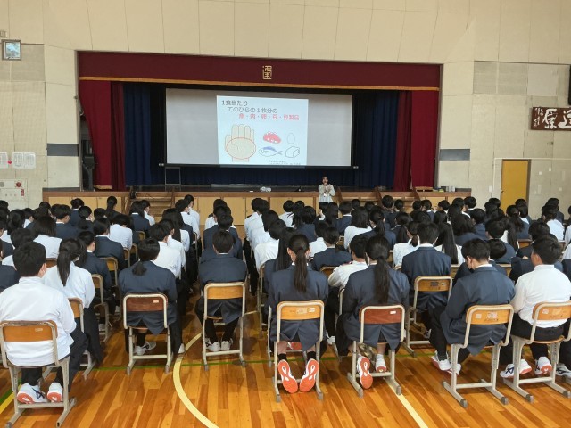 4月23日5時間目に、1年生を対象にした食育集会を実施しました。講師は本校栄養教諭が務めました。多くの生徒が、これから体が大きく成長する時期を迎えます。どんなことを学んだか、ご家庭でもお話をしていただければと思います。