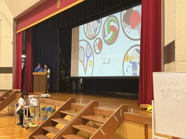 その後、逢妻中学校の一年の流れの説明やクイズなど、様々な楽しい催しがありました。なかでも、学年主任対抗体力テストは大いに盛り上がりました。最後に校歌をうたい、会を終えました。
