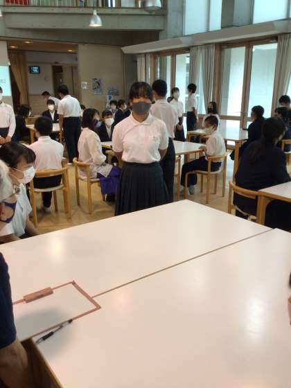 全校朝会で話合いを活発にするための活動をしました。今日のお題は「わたしのテスト勉強法」でした。