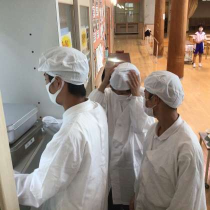 エプロンを着て配膳しています!