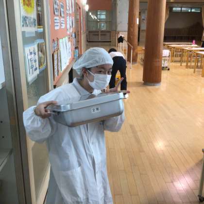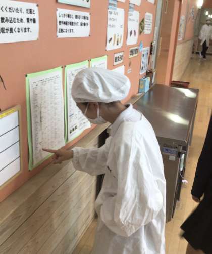 しっかり消毒をして給食準備をしています。