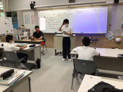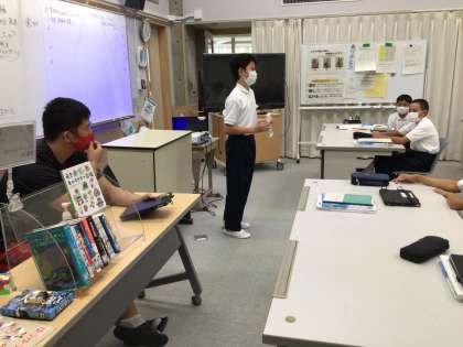 1年生の帰りの会の様子です。図書委員会がおすすめ本を紹介しました。