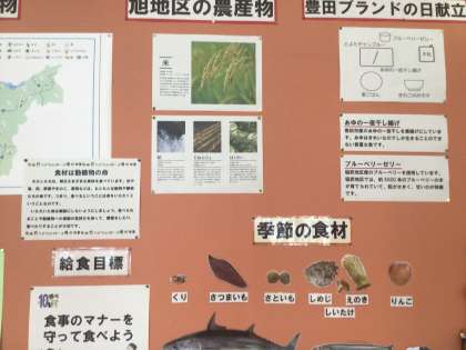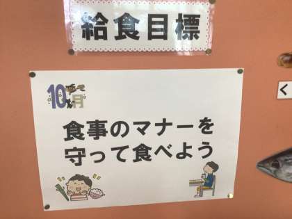 今月の給食目標 公開日 2021/10/01 更新日 2021/10/01 ランチルームから ランチルームの掲示も工夫しています!今月の目標は「食事のマナーを守って食べよう」です。旭地区の農産物も紹介しています!