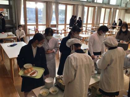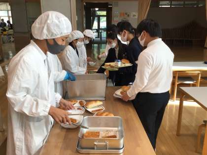 今日も手際よく給食準備をすすめています。ツイストパンが大きくて美味しそうです!