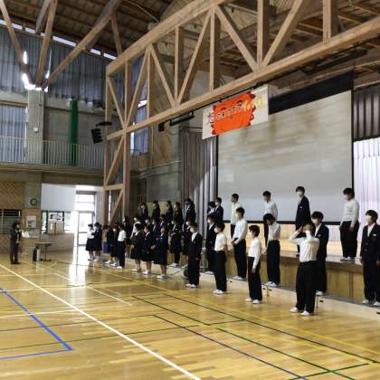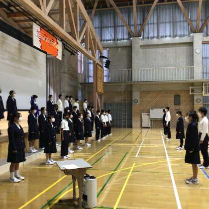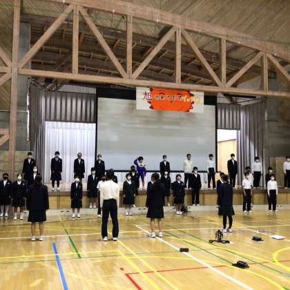 体育館で全校合唱の練習をしました!サンライズ ラプソディを歌います!