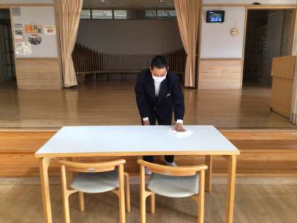 給食当番が机をふいています!給食の感想を話している姿もみられます!