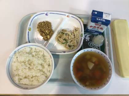 今日は豊田ブランドの日でした!ごはん、納豆巻き、切り干し大根としいたけのサラダ、いものこ汁、なしゼリーをいただきました!