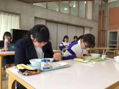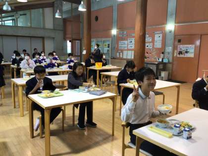 給食のカレーはチーズが入っています!制服につけないように気をつけて食べています!