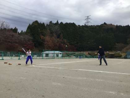 ソフトボールをしています!先生がピッチャーをしています!