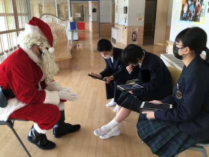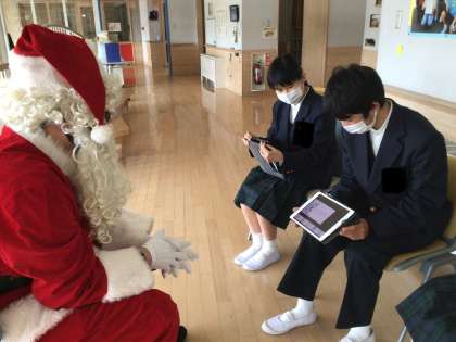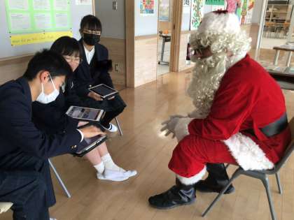 iPadで作ったお店にサンタクロースが来店しました。英語で買い物をしています。