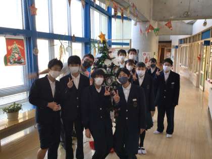 ALTの先生とクリスマスツリーの前で写真撮影しました!