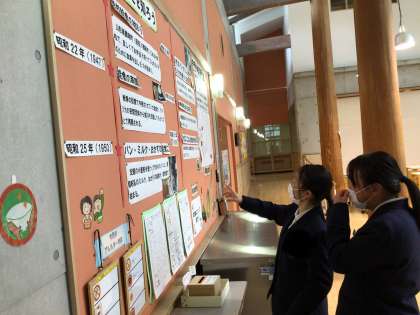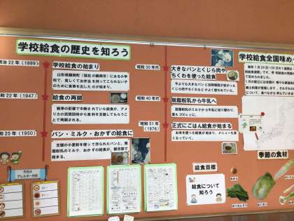 学校給食の歴史を知ろう!という掲示がランチルームでされています。
